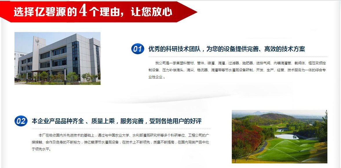 鄄城縣億碧源節(jié)水設(shè)備科技有限公司位于牡丹之鄉(xiāng)菏澤鄄城,是一家集塑料管材、管件、噴灌、滴灌、過(guò)濾器、施肥器、進(jìn)排氣閥、內(nèi)鑲滴灌管、截閥體、恒壓變頻控制設(shè)備、壓力補(bǔ)償?shù)晤^、滴尖、穩(wěn)流器、滴灌帶等節(jié)水灌溉設(shè)備研制、開(kāi)發(fā)、生產(chǎn)、經(jīng)營(yíng)、技術(shù)服務(wù)為一體的綜合專業(yè)性企業(yè) 。